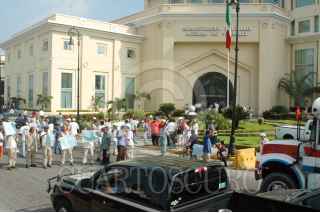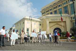 VERACRUZ, VERACRUZ. 05OCTUBRE2009.- Un grupo de al menos cuarenta obreros de la empresa Corporación Portuaria de Veracruz (CPV) se manifestó en el centro de la ciudad en demanda a las autoridades portuarias para que intervengan en la obtencion de más contratos de carga y descarga y en consecuencia se generen empleos para obreros. FOTO: JOSÉ CANDELARIO/CUARTOSCURO.COM