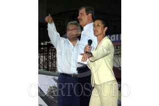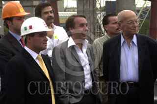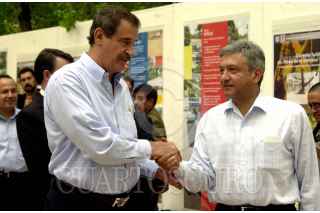 El jefe de Gobierno y la secretaria del medio ambiente capitalinos, Andrés Manuel López Obrador y Claudia Sheimbaum, explican al presidente Fox el tipo de luminarias que se instalaron en el distribuidor víal San Antonio. FOTO: Juan Pablo Zamora/CUARTOSCURO.COM