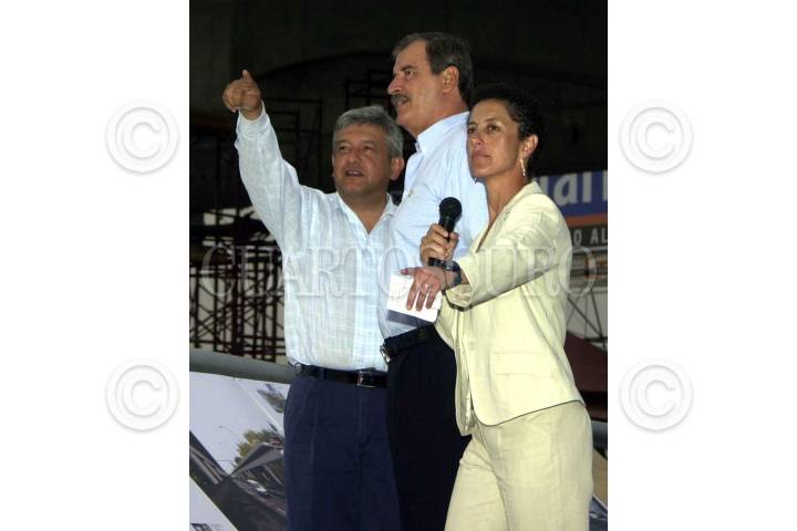 El jefe de Gobierno y la secretaria del medio ambiente capitalinos, Andrés Manuel López Obrador y Claudia Sheimbaum, explican al presidente Fox el tipo de luminarias que se instalaron en el distribuidor víal San Antonio. FOTO: Juan Pablo Zamora/CUARTOSCURO.COM