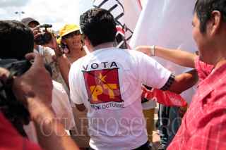 CENTLA, TABASCO, 07OCTUBRE2009.- Grupos de simpatizantes del PRD y PT se enfrentan en dimes y diretes que termina en un pequeño zafarrancho cuando Andrés Manuel López Obrador realizaba el mitin en el parque central de la cabecera municipal de Frontera. Los hechos se registran cuando un reducido grupo del PT llega al acto con una pancarta de otro candidato en donde tenía la palabra López Obrador. FOTO: MARCO POLO GUZMÁN HERNÁNDEZ/CUARTOSCURO.COM