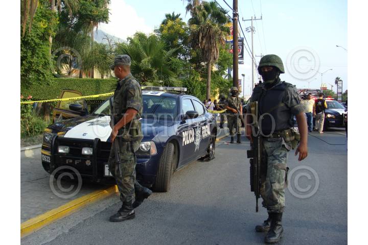 MONTERREY, NUEVO LEÓN, 08OCTUBRE2009.- Soldados inspeccionan el lugar en donde se registro una balacera entre federales y presuntos delincuentes, al parecer los federales trasladaban a cinco detenidos cuando fueron emboscados la patrulla en la viajaban fue baleada, esto en una de las avenidas mas transitadas de esta capital. Dos agentes y tres civiles resultaron heridos, según informaron las autoridades. FOTO: VÍCTOR BADILLO/CUARTOSCURO.COM