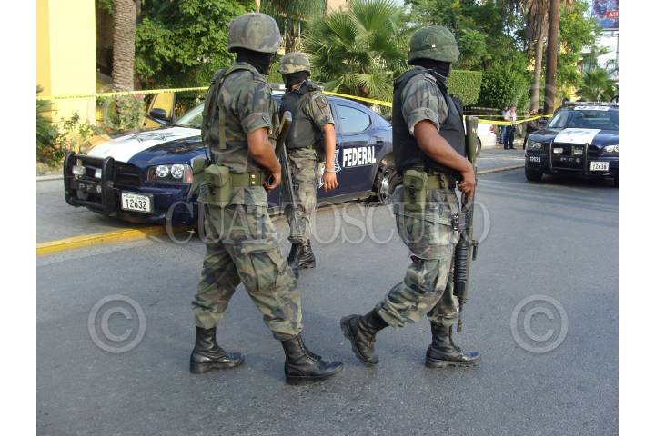 MONTERREY, NUEVO LEÓN, 08OCTUBRE2009.- Soldados inspeccionan el lugar en donde se registro una balacera entre federales y presuntos delincuentes, al parecer los federales trasladaban a cinco detenidos cuando fueron emboscados la patrulla en la viajaban fue baleada, esto en una de las avenidas mas transitadas de esta capital. Dos agentes y tres civiles resultaron heridos, según informaron las autoridades. FOTO: VÍCTOR BADILLO/CUARTOSCURO.COM