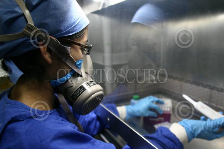 MÉXICO, D.F., 09OCTUBRE2009.- Investigadores del Laboratorio de Conservación de la Escuela Superior de Medicina del Instituto Politécnico Nacional trabajan en la exploración y análisis del virus AH1N1. Para acceder a este lugar existe un estricto control de sanidad: batas, cofias, guantes, cubrebocas y zapatos deben de ser esterilizados. Cuentan con robots, campanas de bioseguridad y escáner digital para la detección de los virus AH1N1 y H5. Los laboratoristas reciben muestras en tubos de transporte enviados por hospitales de todo el país, las cuales son colocadas en refrigeradores y posteriormente en tubos criovirales y gradillas para someterlos al análisis. El proceso de escaneo tarda alrededor de tres horas. Las pruebas son proyectadas en una computadora que analiza el material genético para definir si la persona está infectada. Todo el material empleado en el muestreo y análisis se utiliza sólo una vez y es desechado en bolsas de bioseguridad. El doctor Héctor Manuel Zepeda López, encargado del laboratorio, lleva diariamente el registro de cada caso y realiza gráficas sobre la reacción del virus, esta información es estudiada por un grupo de especialistas en el tema. FOTO: SAÚL LÓPEZ/CUARTOSCURO.COM