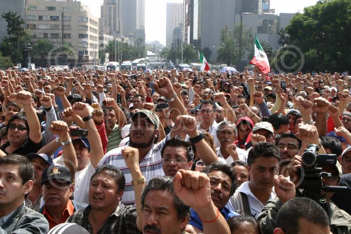 MÉXICO, D.F., 11OCTUBRE2009.- Integrantes del Sindicato de Electricistas encabezados por Martín Esparza, durante un mitin en el monumento a la revolución y marcha hacía la Secretaría de Gobernación donde entregaran un documento en el cual exigen la derogación del decreto que liquida la compañía de luz y Fuerza del Centro y la salida de la Policía Federal. FOTO: SAÚL LÓPEZ/CUARTOSCURO.COM