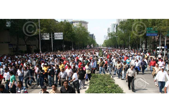 MÉXICO, D.F., 11OCTUBRE2009.- Integrantes del Sindicato de Electricistas encabezados por Martín Esparza, durante un mitin en el monumento a la revolución y marcha hacía la Secretaría de Gobernación donde entregaran un documento en el cual exigen la derogación del decreto que liquida la compañía de luz y Fuerza del Centro y la salida de la Policía Federal. FOTO: SAÚL LÓPEZ/CUARTOSCURO.COM