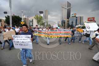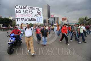 MÉXICO, D.F., 12OCTUBRE2009.- Integrantes del sindicato de luz y fuerza del centro se concentraron en el monumento a la Revolución para después salir con dirección a la Cámara de Diputados donde se manifestaron por la liquidación y desaparición de esta empresa. FOTO: LUIS CARBAYO/CUARTOSCURO.COM