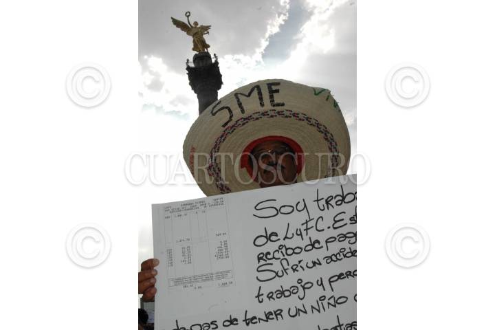 MEXICO, D.F., 15OCTUBRE2009.- Empleados de la compañía de Luz y Fuerza del Centro se manifestaron en una marcha que partió del ángel de la Independencia y culminó en el zócalo debido a que por decreto presidencial fue extinta con lo que más de 40 mil personas quedaron desempleadas. FOTO: ISAAC ESQUIVEL/CUARTOSCURO.COM