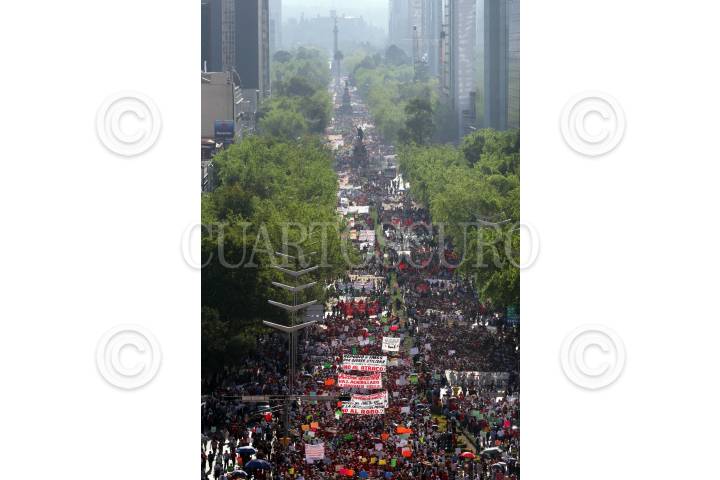 MEXICO, D.F., 15OCTUBRE2009.- Empleados de la compañía de Luz y Fuerza del Centro se manifestaron en una marcha que partió del ángel de la Independencia y culminó en el zócalo debido a que por decreto presidencial fue extinta con lo que más de 40 mil personas quedaron desempleadas. FOTO: ISAAC ESQUIVEL/CUARTOSCURO.COM