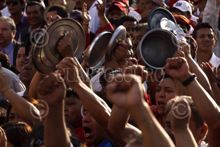 MEXICO, D.F., 15OCTUBRE2009.- Empleados de la compañía de Luz y Fuerza del Centro se manifestaron en una marcha que partió del ángel de la Independencia y culminó en el zócalo debido a que por decreto presidencial fue extinta con lo que más de 40 mil personas quedaron desempleadas. FOTO: ISAAC ESQUIVEL/CUARTOSCURO.COM