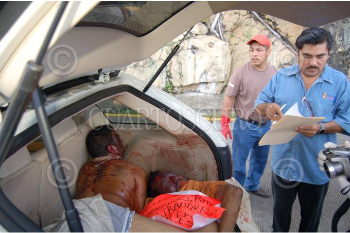 ACAPULCO, GUERRERO, 16OCTUBRE2009.- Ejecutan a cuatro personas en diferentes puntos del municipio de Acapulco de Juárez, resultado de esto dos encajuelados en el punto conocido mundialmente como la quebrada, aparecieron con un narcomensaje que decía: "Esto les va a pasar por rateros, secuestradores y por traicionar al encargado de la plaza, esto es de parte del jefe de jefes". Todos ellos con el tiro de gracia. FOTO: BERNANDINO HERNÁNDEZ/CUARTOSCURO.COM