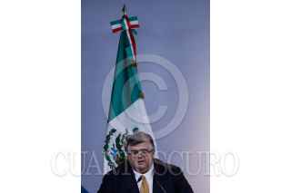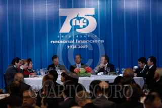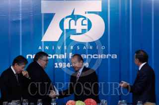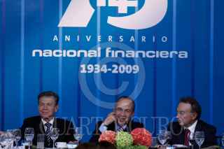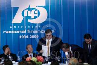 MÉXICO, D.F. 16OCTUBRE2009.- Héctor Rangel Domene, director general de Nacional Financiera (NAFINSA); Felipe Calderón Hinojosa, presidente de México; Agustín Guillermo Carstens Carstenes, Secretario de Hacienda y Crédito Público (SHCP); y Guillermo Ortiz Martínez, presidente del Banco de México durante el 75 Aniversario. FOTO: IVÁN STEPHENS/CUARTOSCURO.COM