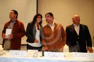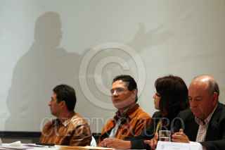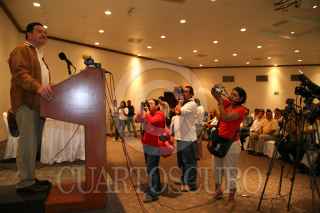 MORELIA, MICHOACAN 18OCTUBRE2009.- Victor Baez, diputado federa, Silvano Aureoles, senador, Fabiola Alanis, dirigente del PRD estatal y el senador Jesús Garibay durante el anuncio de la propuesta económica del PRD, evento donde el coordinador parlamentario del PRD, presentó la Propuesta alternativa al Paquete Economíco del Gobierno Federal, la cual contempla eliminar el 2 por ciento al consumo generalizado. FOTO: CUARTOSCURO.COM