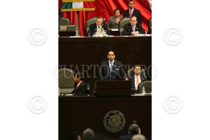 MÉXICO D.F., 22OCTUBRE2009.- Javier Lozano Alarcón, Secretario de Trabajo y Prevención Social, acudió esta mañana a la Cámara de Diputados, donde al inicio de su comparecencia decretaron un receso dadas las protestas de diputados del PT y el titular Abando el salón de plenos por trasbanderas resguardado por Diputados del PAN. FOTO: GUILLERMO PEREA/ CUARTOSCURO.COM