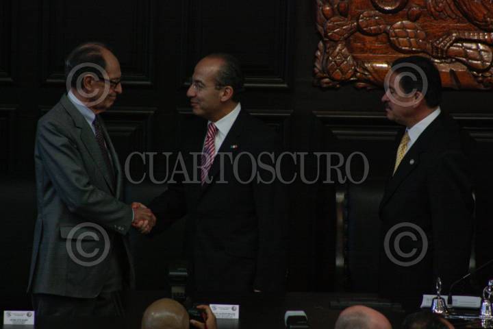MÉXICO, D.F., 22OCTUBRE2009.- Miguel Angel Granados Chapa saluda a Antonio Ortiz Salinas hijo de Antonio Ortiz Mena quien recibió, post mortem, la medalla Belisario Domínguez. FOTO:ESSENE HERNÁNDEZ CASTAÑÓN/CUARTOSCURO.COM