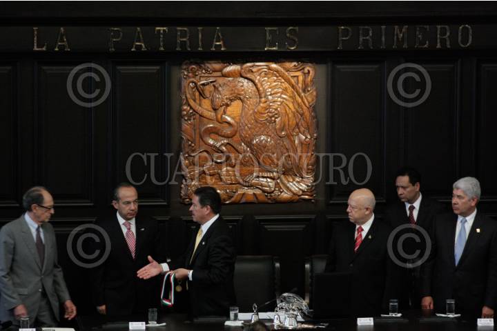 MÉXICO, D.F., 22OCTUBRE2009.- Miguel Angel Granados Chapa saluda a Antonio Ortiz Salinas hijo de Antonio Ortiz Mena quien recibió, post mortem, la medalla Belisario Domínguez. FOTO:ESSENE HERNÁNDEZ CASTAÑÓN/CUARTOSCURO.COM