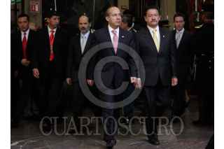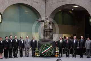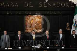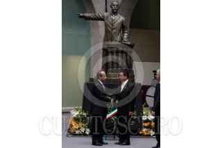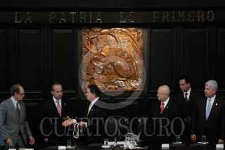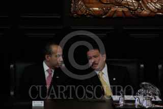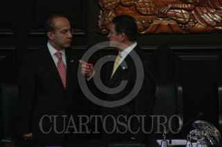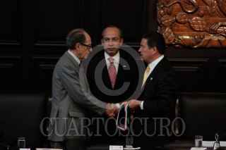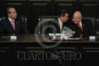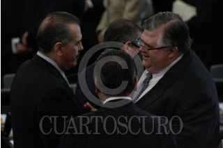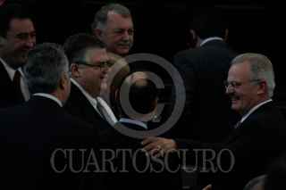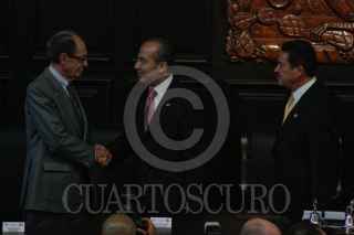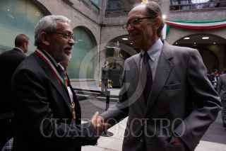 MÉXICO, D.F., 22OCTUBRE2009.- Miguel Angel Granados Chapa saluda a Antonio Ortiz Salinas hijo de Antonio Ortiz Mena quien recibió, post mortem, la medalla Belisario Domínguez. FOTO:ESSENE HERNÁNDEZ CASTAÑÓN/CUARTOSCURO.COM
