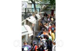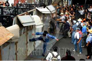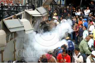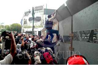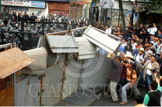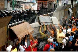 MÉXICO, D.F., 23OTCUBRE2009.- Integrantes del Sindicato de Trabajadores Electricistas (SME), de la Asamblea Popular de Pueblos de Oaxaca (APPO) y del Sindicato de Trabajadores de la Coordinadora Nacional de Trabajadores de la Educación (CNTE), marcharon en protesta desde el monumento a la Revolución hacia las instalaciones de la Secretaria de Gobernación en donde se registro un ligero enfrentamiento entre estos y el cuerpo de Granaderos derribando las vallas de metal que instalan para el resguardo de esta dependencia. Posteriormente se dirigieron a las instalaciones del Senado de la República en donde se quedaron en plantón permanente. FOTO: LUIS CARBAYO/CUARTOSCURO.COM