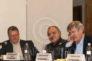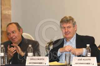 MÉXICO, D.F. 26OCTUBRE2009.- Los periodistas Sergio Sarmiento y Hector Aguilar Camin junto con el escritor Gerald Martin autor del libro de "Gabriel García Márquez Una Vida" durante la preesentacion de la publicación que se realizó en la sala Manuel M. Ponce del Palacio de Bellas Artes. FOTO: SAÚL LÓPEZ/CUARTOSCURO.COM