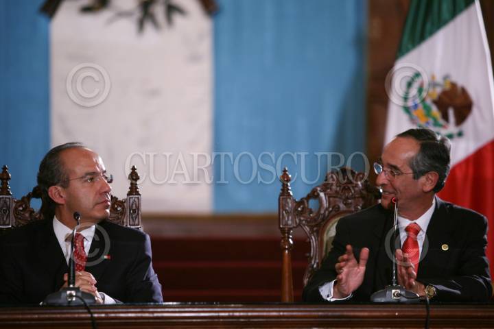 GUATEMALA, GUATEMALA, 26OCTUBRE 2009.- Felipe Calderon Presidente de México, acompañado por Alvaro Colom Presidente de Guatemala, durante la firma de documentos y difusion del comunicado conjunto, que tovo lugar en el patio de cultura del palacio nacional de cultura FOTO: ALFREDO GUERRERO/CUARTOSCURO.COM
