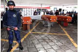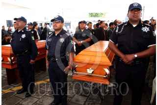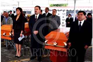 PUEBLA, PUEBLA, 28OCTUBRE2009.- Blanca Alcala, Presidenta Municipal de Puebla y Mario Marín Torres, Gobernador del estado, rindieron un homenaje luctuoso a los elementos de la Policía Municipal que perdieran la vida el día de ayer. Medios locales manejan que la presunta víctima de una persecución, que en principio declaró ser un simple comerciante, admitió finalmente que se dedicaba a la venta de estupefacientes. En este sentido el gobierno estatal solicitó formalmente la intervención del Ejército Mexicano y de la Policía Federal (PF), para que realizen patrullajes en las calles de la ciudad de Puebla. Esta mañana en la residencia oficial del ejecutivo del Estado Casa Puebla, se realizó una reunión encabezada por el mismo mandatario y a la que asistieron integrantes del gabinete de seguridad, así como representantes de la Procuraduría General de la República (PGR), de la XXV Zona Militar y de la presidencia municipal de Puebla. Uno de los acuerdos del cónclave fue destinar más recursos para ampliar el arsenal de los cuerpos de seguridad pública y la compra de más chalecos antibalas. FOTO: FRANCO/CUARTOSCURO.COM