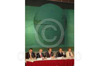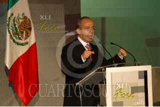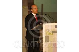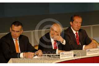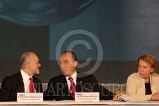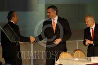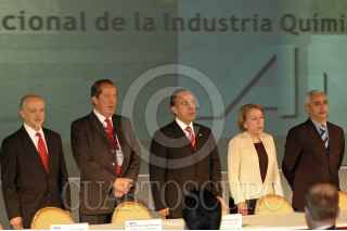 MÉXICO, D.F., 29OCTUBRE2009.- El presidente Felipe Calderón saluda a Juan José Suárez Coppel, director general de Petróleos Mexicanos; y el Dr. Mario Molina, presidente del Centro Mario Molina y premio Nobel de Química y José de Jesús Garcia,al termino de la inauguración del XLI Foro Nacional de la Industria Química. FOTO: RODOLFO ANGULO/CUARTOSCURO.COM