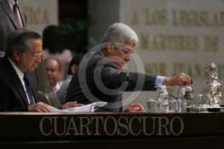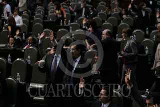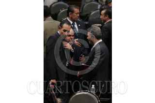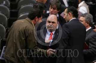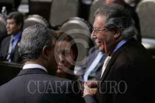 MÉXICO D.F. 30OCTUBRE2009.-Gerardo Fernández Noroña, Diputado del PT, Robert Gil, Mario Alberto Becerra Pocoroba, Diputados del PAN, dialogan con David Penchina, Diputado del PRI, durante la sesión en la Cámara de Diputados, en la cual se decreto en receso para esperar la ley de ingresos y el Miscelánea Fiscal para el Ejercicio del 2010, que se discute en el Senado de la Republica. FOTO: GUILLERMO PEREA/CUARTOSCURO.COM