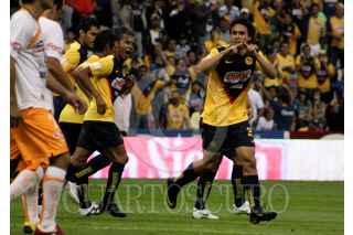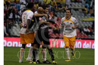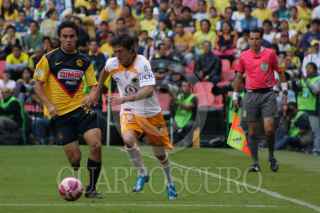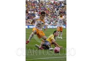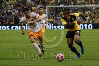 MÉXICO, D.F., 01NOVIEMBRE2009.- Cristian Andres Alvarez del equipo de futbol Jaguares de Chiapas y Jean Beausejour del America durante su encuentro en el partido de la fecha 14 del torneo de apertura 2009, en el estadio Azteca. Empatados Aguilas del America 1- 1 Jaguares de Chiapas. FOTO: ESSENE HERNÁNDEZ/CUARTOSCURO.COM