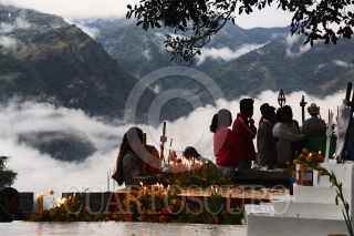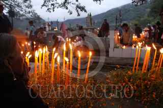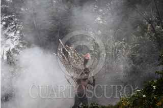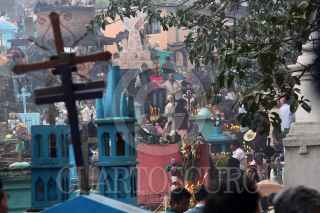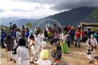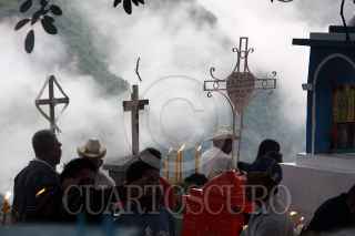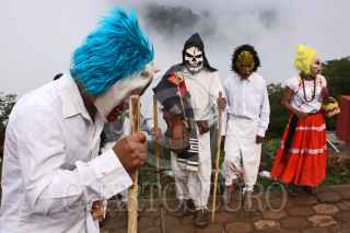 MAZATLÁN VILLA FLORES, TEOTITLAN, OAXACA, 02NOVIEMBRE2009.- Jóvenes ataviados con las prendas tradicionales, calzón, camisa de manta, huaraches y máscaras de madera; bailan los sones de la región, se les conoce como “huehuentones” (palabra nauatl) “Chashu’u” (en mazateco) o “señores ombligo”; tradición que se suma a esta representación que la misma comunidad trata de rescatar en las festividades de los “antepasados mayores” En medio de cordilleras que dan forma a la Sierra Madre Oriental, al noroeste de la capital del estado de Oaxaca donde se ubica el panteón de la comunidad. FOTOREPORTAJE: MAXIMILIANO NUÑEZ/CUARTOSCURO.COM