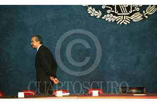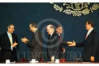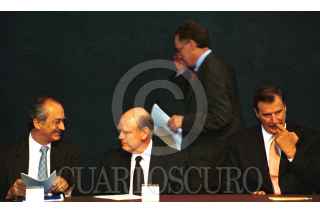 El presidente Vicente Fox y Francisco Gil Díaz, durante el acto "México a la Vanguardia en la Administración de la Deuda Externa" al que asistieron también John Snow del Tesoro de E.U., Horst Köhler del FMI. Fox anunció la liquidación anticipada de los bonos Brady.