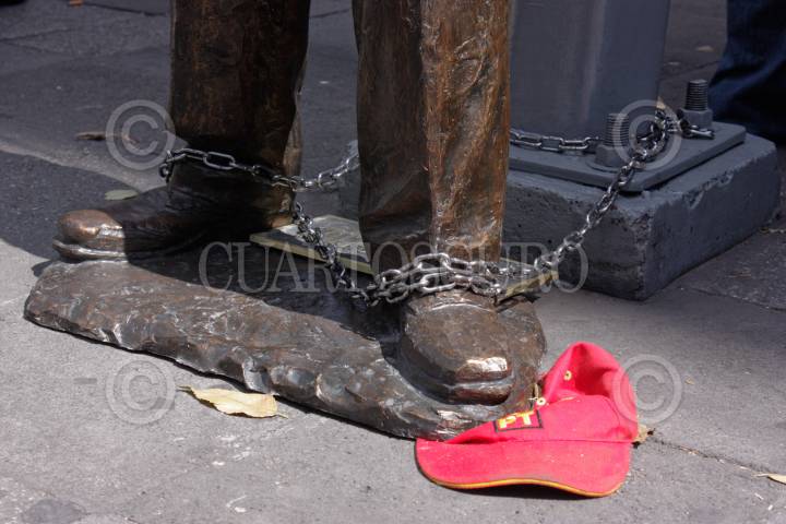 MÉXICO, D.F., 05NOVIEMBRE2009.- Rafael Acosta "Juanito", delegado con licencia en Iztapalapa colocó una estatua de su figura en el cruce de Balderas y Juarez. Esta estatua se encuentra encadenada a un poste para evitar que se la roben, además estará en diversos puntos de la ciudad hasta el 25 de noviembre. FOTO: ESSENE HERNÁNDEZ/CUARTOSCURO.COM