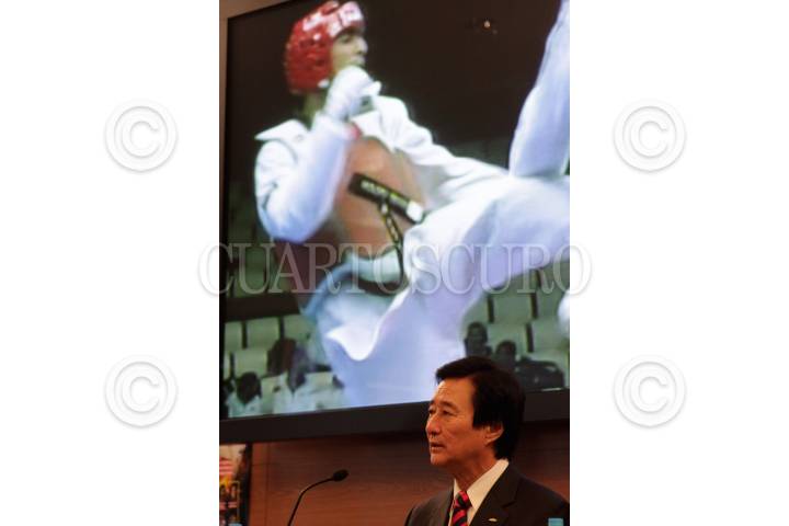 MÉXICO, D.F., 05NOVIEMBRE2009.- Damián Villa, taekwondoin, Daiwon Moon, director del Comite Organizador e Idulio Islas, taekwondoin dieron a conocer los detalles de la primer Liga Mundial de Taekwondo México 2009. Este evento contará con la participación de 16 medallistas olimpicos mundiales, el próximo 14 de noviembre en el Palacio de los Deportes. FOTO: ESSENE HERNÁNDEZ/CUARTOSCURO.COM