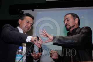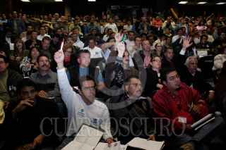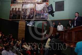 MÉXICO, D.F., 07NOVIEMBRE2009.- Martín Esparza, lider del Sindicato Mexicano de Electricistas (SME) y Francisco Hernández Juárez, lider del Sindicato de Telefonistas durante la Asamblea urgente de la Unión Nacional de Trabajadores para establecer su plan de acción en apoyo al paro cívico nacional previsto para el 11 de noviembre en el Sindicato de Telefonistas FOTO: ESSENE HERNÁNDEZ/CUARTOSCURO.COM