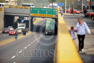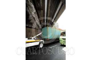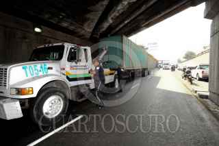 MÉXICO, D.F., 12NOVIEMBRE2009.- Un trailer de doble remolque quedo atorado en carriles centrales de Avenida Constituyentes debajo del puente de Periférico por lo que tuvieron que maniobrar por casi una hora elementos de la Secretaria de Seguridad Publica para desatorarlo. FOTO: LUIS CARBAYO/CUARTOSCURO.COM