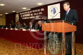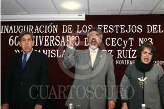 ECATEPEC, EDO. DE MÉX. 12NOVIEMBRE2009.- José Enrique Villa Rivera, Director del Instituto Politécnico Nacional (IPN) acompañado Cuauhtémoc Cárdenas Solórzano, Presidente de la Fundación para la Democracia, en el Centro de Estudios Científicos y Tecnológicos No. 3 “ Estanislao Ramírez Ruiz” en la inguración del alua interactiva durante el inicio a las actividades de la conmemoración del 60 Aniversario del CECyT No. 3 ubicado en este municipio. FOTO: GUILLERMO PEREA/CUARTOSCURO.COM