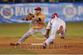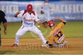MAZATLÁN, SINALOA, 14NOVIEMBRE2009.- Heber Gómez, de los Venados de Mazatlán, se barre para robar la cuarta base a Adán Muñoz, de los Mayos de Navojoa, durante el primer partido de la serie con una blanqueada de los locales de 6 carreras a 0, ayer por la noche. FOTO: PATRICIA MEJÍA/EL DEBATE DE MAZATLÁN/CUARTOSCURO.COM