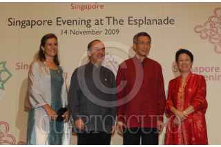 MÉXICO, D.F., 14NOVIEMBRE2009.- La primera dama de México, Margarita Zavala junto a Felipe Calderón, Presidente de México y Lee Hisien Loong, primer ministro de Singapur y su esposa Ho Ching previo a la cena que se realizó en honor a los lideres del APEC. FOTO: ALFREDO GUERRERO/CUARTOSCURO.COM