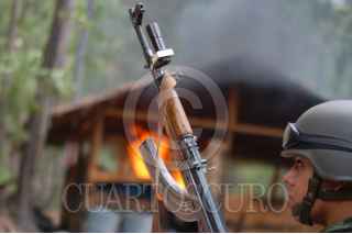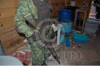VILLA MADERO, MICHOACÁN, 15NOVIEMBRE2009- Dos "narcolaboratorios" fueron asegurados por el Ejército Mexicano en la comunidad de Las Cruces perteneciente al municipio de Villa Madero. A través de una denuncia ciudadana, el personal militar fue informado de la existencia de dos laboratorios clandestinos en dicha población, tras lo cual los efectivos se hicieron presentes en el lugar, donde se logró asegurar cuatro armas largas, un cargador,457 cartuchos, una camioneta, dos cuatrimotos, 60 bultos de sosa caustica de 25 kilogramos cada uno, 50 kilogramos de una sustancia granulosa al parecer “crystal”. FOTO: LEOVIGILDO GONZÁLEZ/CUARTOSCURO.COM