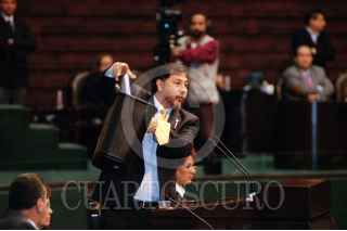 MÉXICO, D.F., 16NOVIEMBRE2009.- El diputado Gerardo Fernandez Noroña tira la gaceta del Presupuesto de Egresos de la Federación para el ejercicio fiscal 2010 durante la sesión en la Camara de Diputados FOTO: SÁSHENKA GUTIÉRREZ/CUARTOSCURO.COM