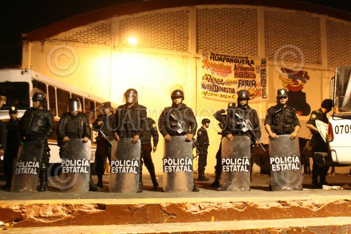 ECATEPEC, ESTADO DE MÉXICO, 19NOVIEMBRE2009.- Policias estatales blindan las inmediaciones del palacio municipal y el centro civico de Ecatepec, en dicho lugar fueron trasladados los detenidos del zafarrancho que se sucito la tarde de hoy entre organizaciones de trasnportistas FOTO: SAÚL LÓPEZ/CUARTOSCURO.COM