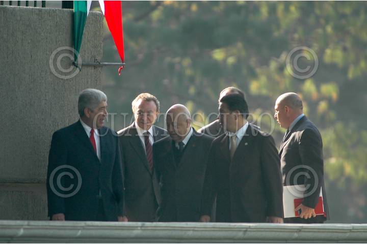 MÉXICO, D.F., 20NOVIEMBRE2009.- Guillermo Ortiz Mayagoitia, ministro presidente de la Suprema Corte de Justicia de la Nación; Fernando Gómez Mont; Secretario de Gobernación, Mariano Francisco Saynez Mendoza; Secretario de Marina Armada de México; Guillermo Ortiz, presidente del Banco de México, Eduardo Sojo Garza-Aldape; Secretario de Economía montaron una guardia de honor en el homenaje a Francisco I. Madero en la Residencia oficial de Los Pinos con motivo del aniversario de la revolución mexicana. FOTO: IVAN STEPHENS/CUARTOSCURO.COM