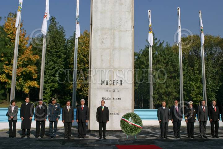 MÉXICO, D.F., 20NOVIEMBRE2009.- Guillermo Ortiz Mayagoitia, ministro presidente de la Suprema Corte de Justicia de la Nación; Fernando Gómez Mont; Secretario de Gobernación, Mariano Francisco Saynez Mendoza; Secretario de Marina Armada de México; Guillermo Ortiz, presidente del Banco de México, Eduardo Sojo Garza-Aldape; Secretario de Economía montaron una guardia de honor en el homenaje a Francisco I. Madero en la Residencia oficial de Los Pinos con motivo del aniversario de la revolución mexicana. FOTO: IVAN STEPHENS/CUARTOSCURO.COM