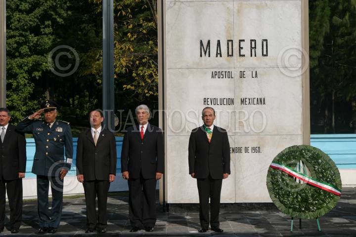 MÉXICO, D.F., 20NOVIEMBRE2009.- Guillermo Ortiz Mayagoitia, ministro presidente de la Suprema Corte de Justicia de la Nación; Fernando Gómez Mont; Secretario de Gobernación, Mariano Francisco Saynez Mendoza; Secretario de Marina Armada de México; Guillermo Ortiz, presidente del Banco de México, Eduardo Sojo Garza-Aldape; Secretario de Economía montaron una guardia de honor en el homenaje a Francisco I. Madero en la Residencia oficial de Los Pinos con motivo del aniversario de la revolución mexicana. FOTO: IVAN STEPHENS/CUARTOSCURO.COM