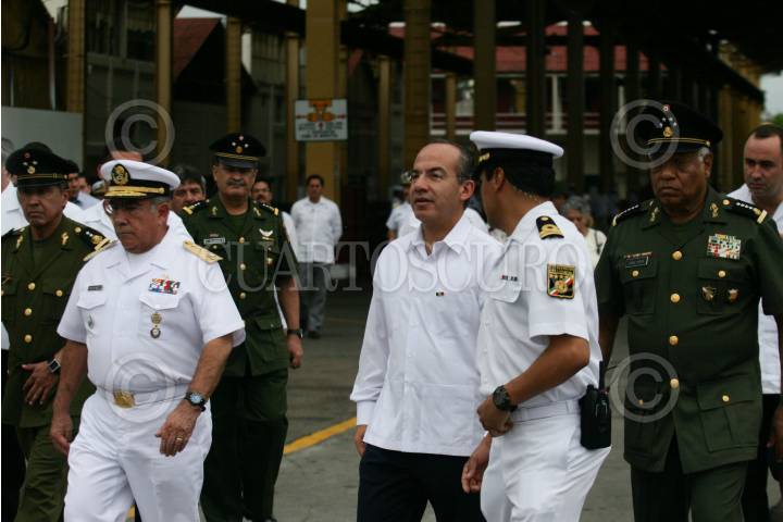 TAMPICO, TAMAULIPAS, 23NOVIEMBRE2009.- Felipe Calderón Hinojosa, Presidente de México, acompañado de su esposa Margarita Zavala, Genaro García Luna, Secretario de Seguridad, Eugenio Hernández Flores, Gobernador del Estado de Tamaulipas, Francisco Zaynez Mendoza, Secretario de Marina, Patricia Espinosa Cantellanos, Secretaria de Relaciones Exteriores y Guillermo Galván Galván, Secretario de Defensa Nacional, donde la titular de SER, fungió como madrina de la “Patrulla Oceánica ARM Revolución” el cual fue botado en ceremonia solemne y encabezada por el jefe del ejecutivo, así como el abanderamiento de dos Patrullas Interceptoras Clase Polaris II, esto en el Astillero No.1 ubicado en el puerto de esta ciudad, con esta celebración se conmemoro el Día de la Armada de México. FOTO: GUILLERMO PEREA/CUARTOSCURO.COM