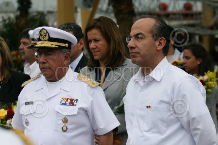 TAMPICO, TAMAULIPAS, 23NOVIEMBRE2009.- Felipe Calderón Hinojosa, Presidente de México, acompañado de su esposa Margarita Zavala, Genaro García Luna, Secretario de Seguridad, Eugenio Hernández Flores, Gobernador del Estado de Tamaulipas, Francisco Zaynez Mendoza, Secretario de Marina, Patricia Espinosa Cantellanos, Secretaria de Relaciones Exteriores y Guillermo Galván Galván, Secretario de Defensa Nacional, donde la titular de SER, fungió como madrina de la “Patrulla Oceánica ARM Revolución” el cual fue botado en ceremonia solemne y encabezada por el jefe del ejecutivo, así como el abanderamiento de dos Patrullas Interceptoras Clase Polaris II, esto en el Astillero No.1 ubicado en el puerto de esta ciudad, con esta celebración se conmemoro el Día de la Armada de México. FOTO: GUILLERMO PEREA/CUARTOSCURO.COM