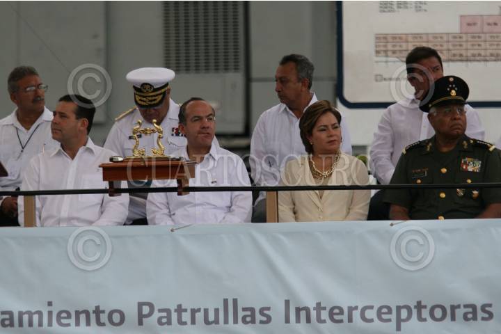 TAMPICO, TAMAULIPAS, 23NOVIEMBRE2009.- Felipe Calderón Hinojosa, Presidente de México, acompañado de su esposa Margarita Zavala, Genaro García Luna, Secretario de Seguridad, Eugenio Hernández Flores, Gobernador del Estado de Tamaulipas, Francisco Zaynez Mendoza, Secretario de Marina, Patricia Espinosa Cantellanos, Secretaria de Relaciones Exteriores y Guillermo Galván Galván, Secretario de Defensa Nacional, donde la titular de SER, fungió como madrina de la “Patrulla Oceánica ARM Revolución” el cual fue botado en ceremonia solemne y encabezada por el jefe del ejecutivo, así como el abanderamiento de dos Patrullas Interceptoras Clase Polaris II, esto en el Astillero No.1 ubicado en el puerto de esta ciudad, con esta celebración se conmemoro el Día de la Armada de México. FOTO: GUILLERMO PEREA/CUARTOSCURO.COM