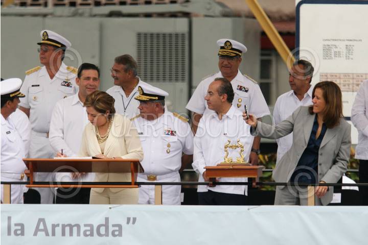 TAMPICO, TAMAULIPAS, 23NOVIEMBRE2009.- Felipe Calderón Hinojosa, Presidente de México, acompañado de su esposa Margarita Zavala, Genaro García Luna, Secretario de Seguridad, Eugenio Hernández Flores, Gobernador del Estado de Tamaulipas, Francisco Zaynez Mendoza, Secretario de Marina, Patricia Espinosa Cantellanos, Secretaria de Relaciones Exteriores y Guillermo Galván Galván, Secretario de Defensa Nacional, donde la titular de SER, fungió como madrina de la “Patrulla Oceánica ARM Revolución” el cual fue botado en ceremonia solemne y encabezada por el jefe del ejecutivo, así como el abanderamiento de dos Patrullas Interceptoras Clase Polaris II, esto en el Astillero No.1 ubicado en el puerto de esta ciudad, con esta celebración se conmemoro el Día de la Armada de México. FOTO: GUILLERMO PEREA/CUARTOSCURO.COM
