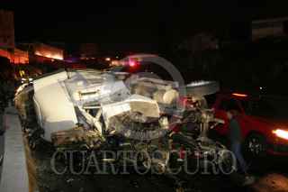 MÉXICO, D.F., 24NOVIEMBRE2009.- Un trailer con más de 20 toneladas de corcholata volcó al filo de la media noche en el km 31 de la autopista México Cuernavaca con dirección al Distrito Federal. El conductor perdió la vida. FOTO: LUZ ACEVEDO/CUARTOSCURO.COM