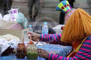 OAXACA, OAXACA, 25NOVIEMBRE2009.- Un payaso del zócalo de la ciudad se deleita con su comida en un puesto de la appo, aprovechando el mitin político. FOTO: MAX NÚÑEZ/CUARTOSCURO.COM