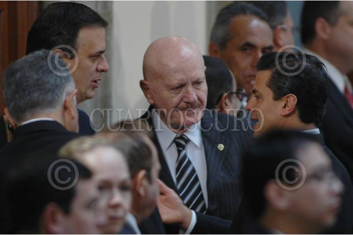 MÉXICO, D.F., 26NOVIEMBRE2009.- El presidente Felipe Calderón se despide de Carlos Navarrete, presdiente de la mesa directiva de la Cámara de Senadores al termino de la XXVII Sesión del Consejo Nacional de Seguridad Pública que se realizo en el Salón Tesorería de Palacio Nacional. FOTO: RODOLFO ANGULO/CUARTOSCURO.COM