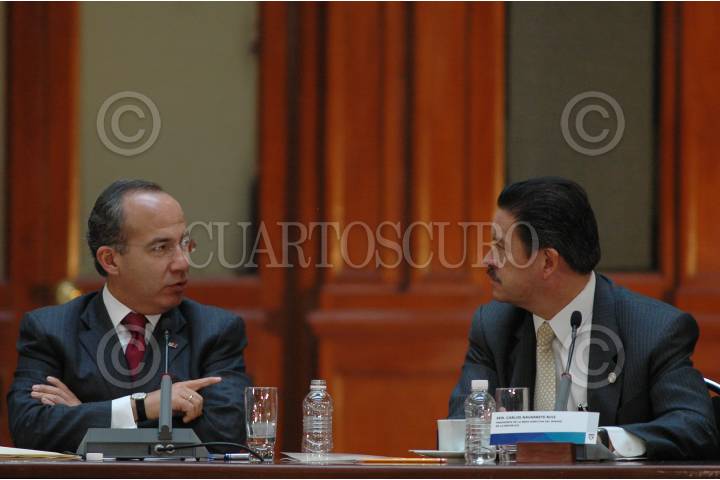 MÉXICO, D.F., 26NOVIEMBRE2009.- El presidente Felipe Calderón se despide de Carlos Navarrete, presdiente de la mesa directiva de la Cámara de Senadores al termino de la XXVII Sesión del Consejo Nacional de Seguridad Pública que se realizo en el Salón Tesorería de Palacio Nacional. FOTO: RODOLFO ANGULO/CUARTOSCURO.COM